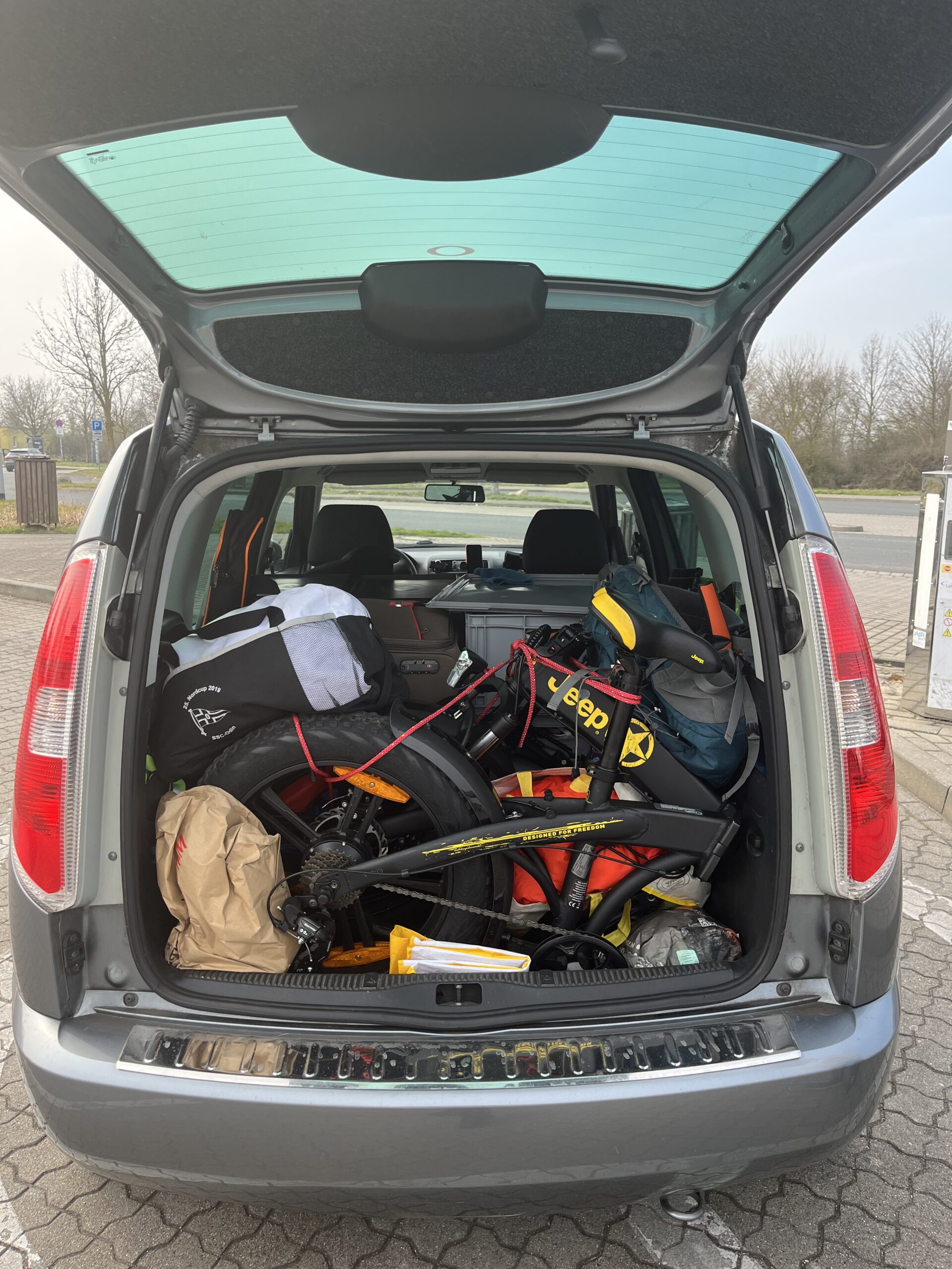 Zusätzlich zum normalen Gepäck kommen ja auch noch diverse Segelsachen, mein E-Bike, mein Autozelt und alle Utensilien, die ich womöglich brauche, um im Auto zu übernachten.