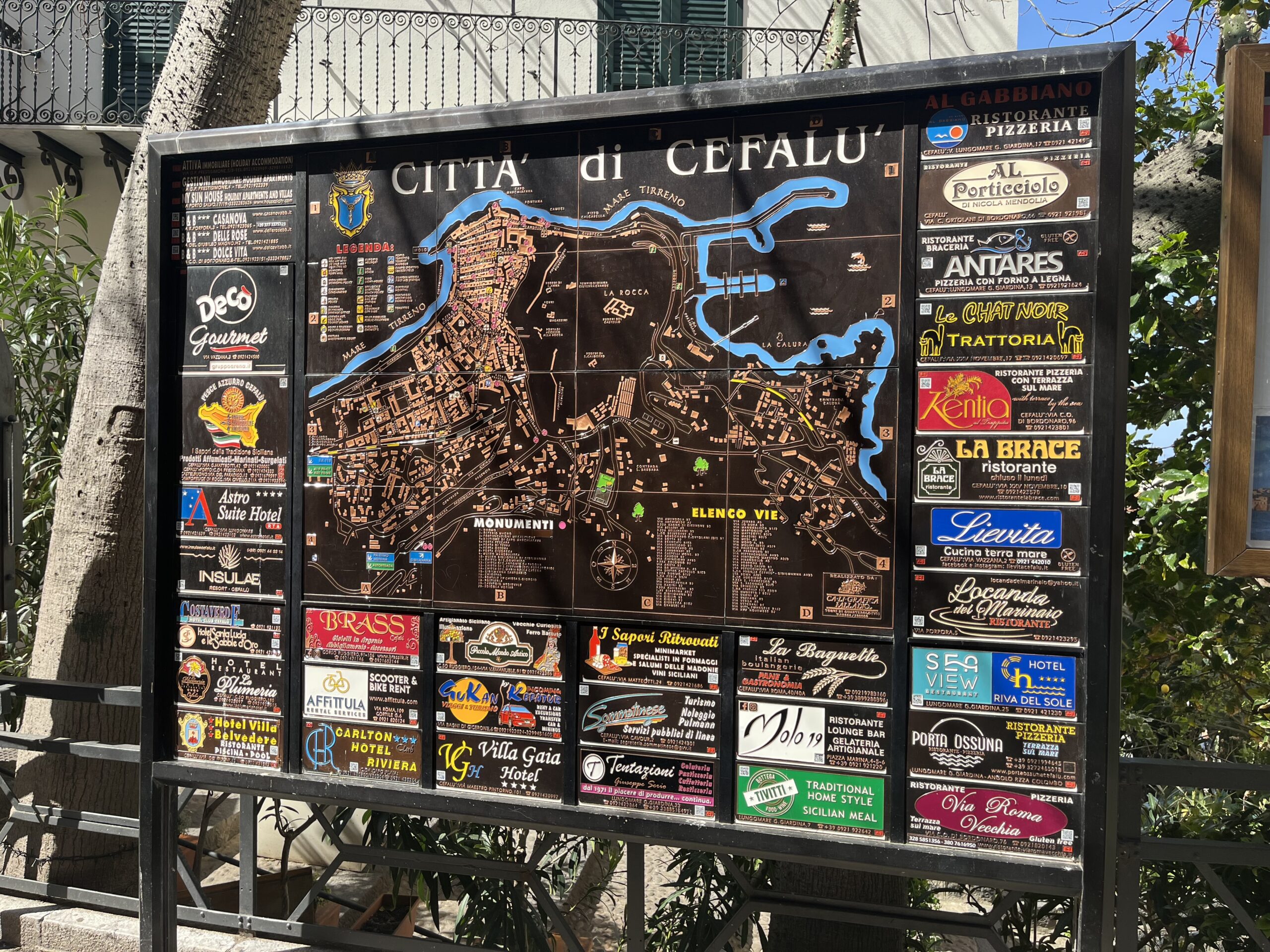 Cefalu hat eine sehr schöne Kathedrale, eine malerische Innenstadt und viele schöne Restaurants entlang der Küstenlinie, um in der Sonne zu essen wählen wir eines zum Mittagessen aus …. sitzen aber trotzdem im Schatten, aber mit traumhaftem Blick und hervorragendem Essen (Caponala, Bruschette, Lachs und Dorade).