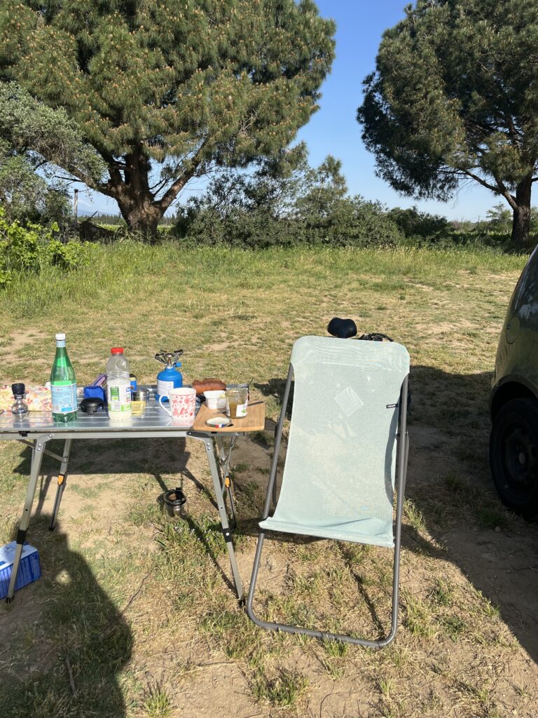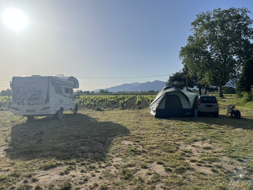 Mein erstes Camping stand an … idyllisch auf einem Weingut mit sehr nettem Empfang in leckerer Verkostung …. wer steht neben mir? Auf der einen Seite Rentner aus Brandenburg, auf der anderen Seite Niederländer …. Wir haben abends noch lange nett beisammen gesessen.
